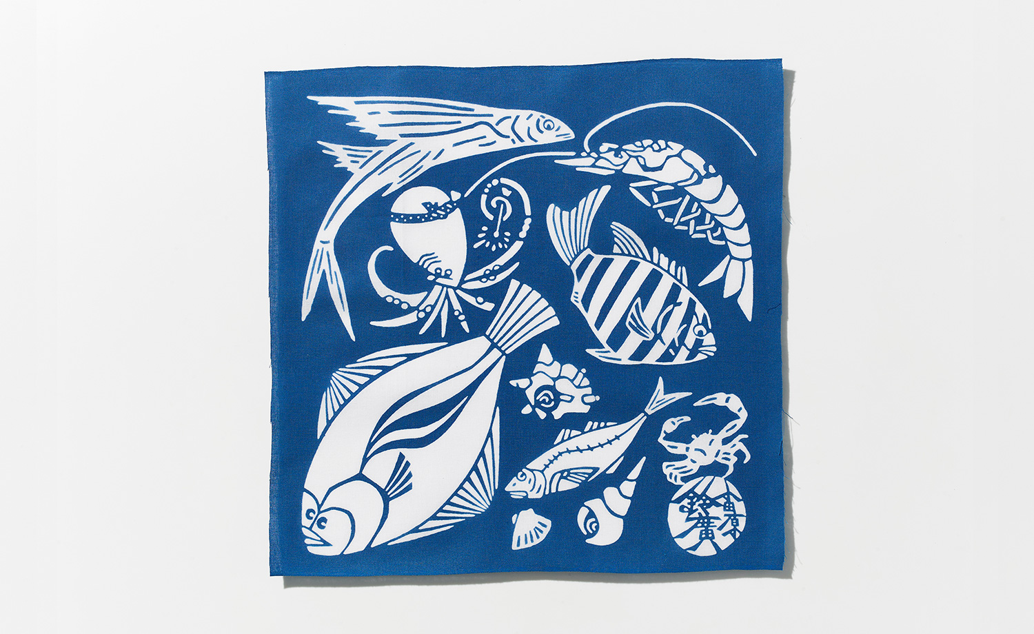 夏にお配りしている手ぬぐいの御絵布。鯵・飛魚・鰈・真蛸・石鯛・サザエに車海老。夏に小田原漁港に揚がる、いきいきとした魚たちを描きました。ひょうきんな蛸は、線香花火を楽しんでいるようです。
