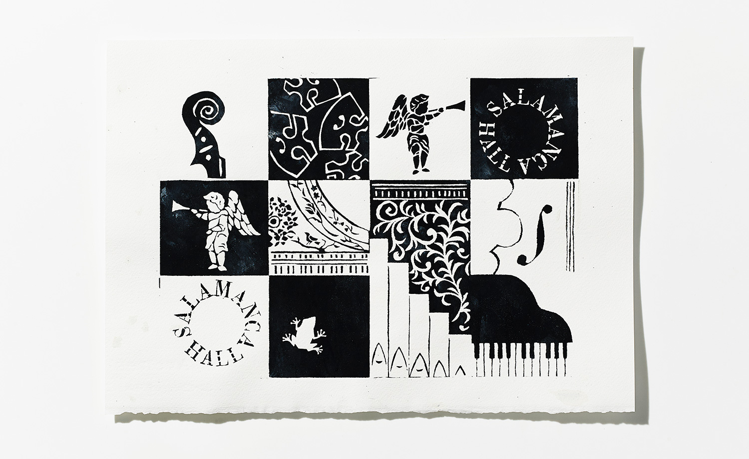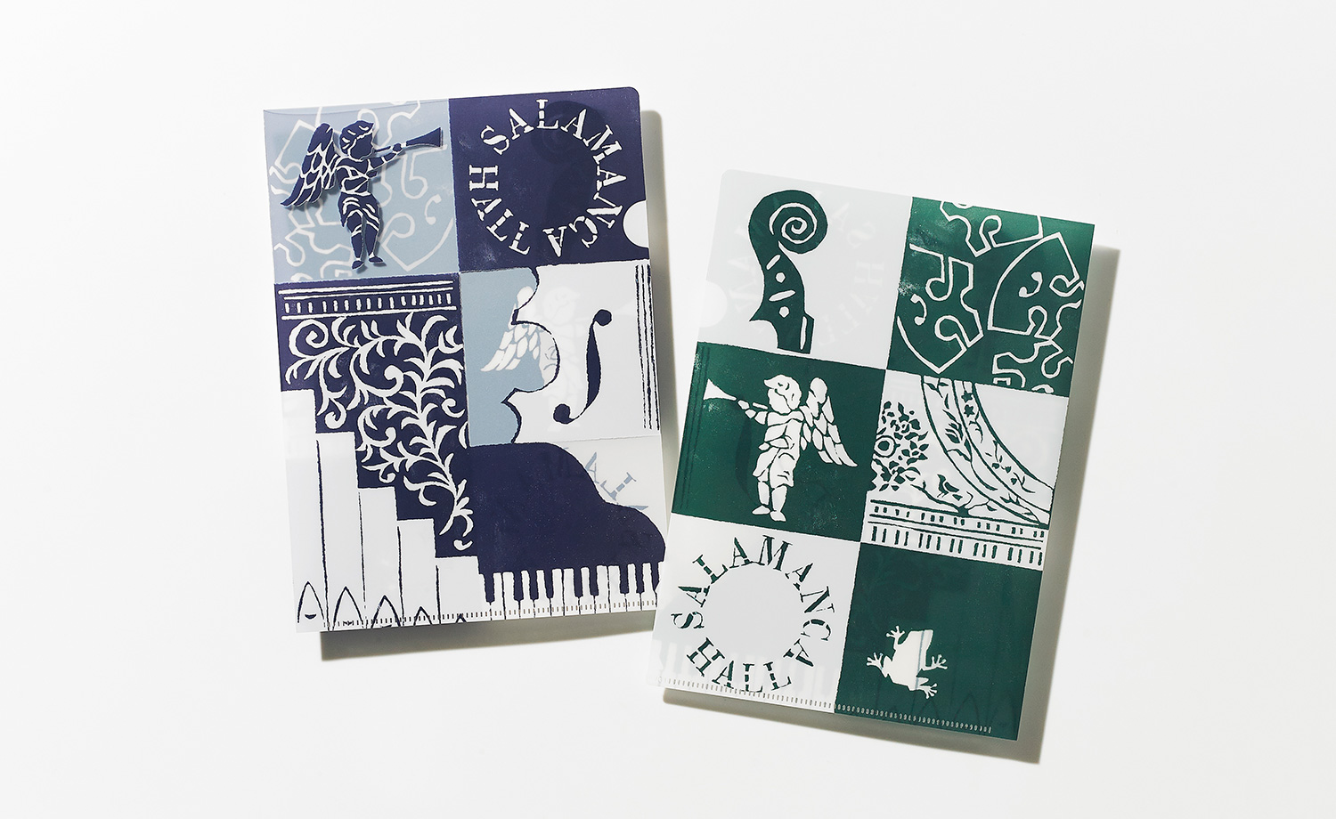 2019年に25周年を迎える岐阜県サラマンカホールの記念チケットファイルを制作しました。スペインサラマンカ大聖堂と同じ精巧なレリーフ、岐阜提灯をイメージしたシャンデリアなど至るところに見所があるホール。ピアノ、ヴァイオリンの駒やスクロール、チェロのF字孔、チェンバロなど音楽を彩る楽器とともに市松模様のなかに配しました。
